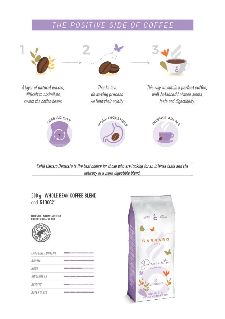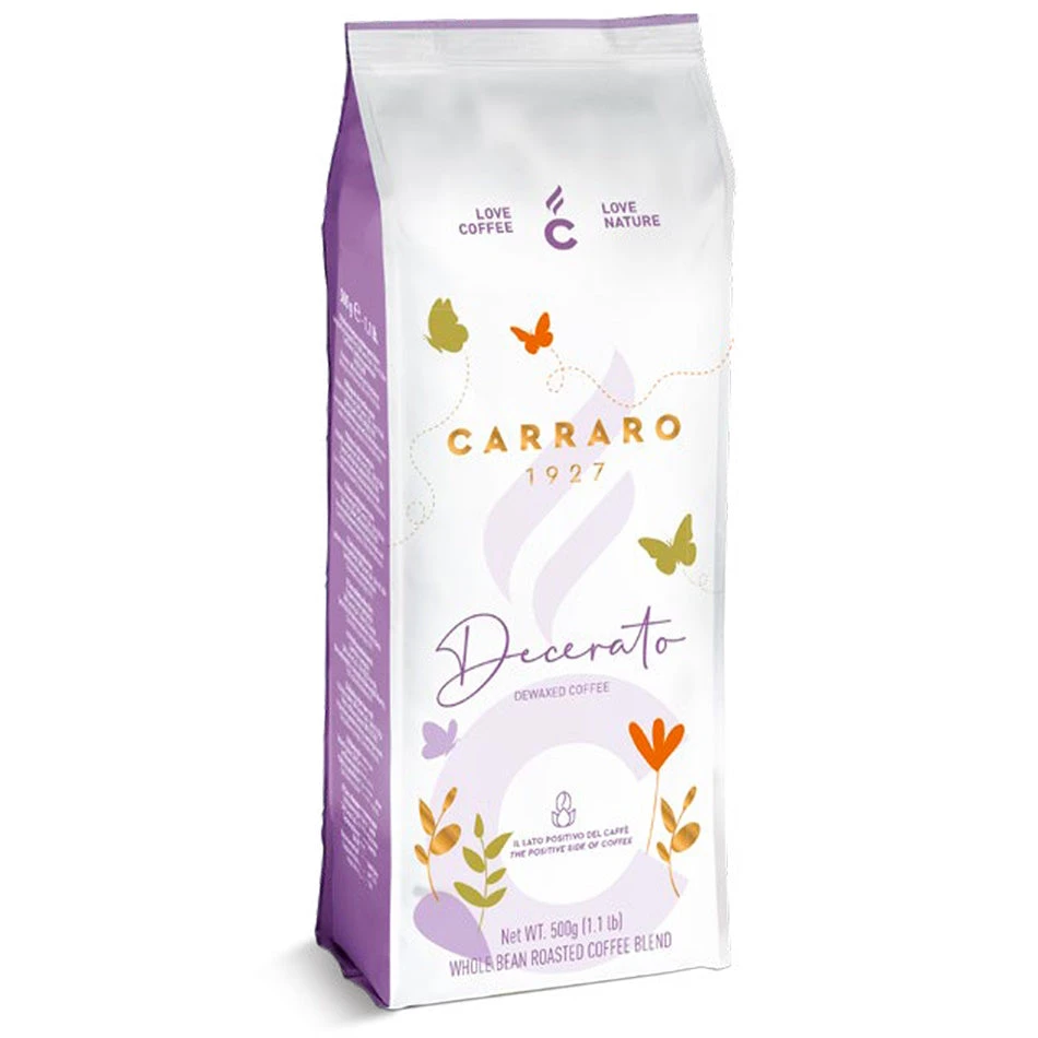 Carraro Decerato is a 90/10 blend of Arabica and Robusta coffees that have been specially processed to reduce acidity. Through a processed known as “dewaxing” the natural waxes present in coffee beans are removed prior to roasting, resulting in coffee that is far less acidic and naturally lower in caffeine. Decerato is sweet a medium roast with fragrant notes of honey and nectar. We recommend this coffee to anyone with a sensitive stomach or who enjoys a gentler and milder cup.